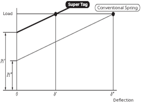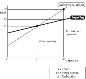 Because the initial tension P1’ is large, a small deflection σ‘ only is required to obtain the required load P, allowing compact design.